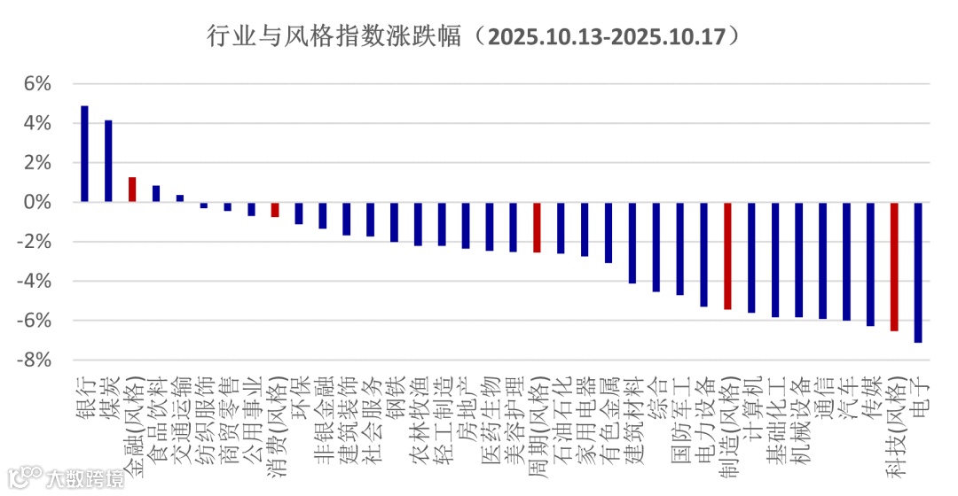 行业方面,关税等问题的反复扰动加重了避险情绪,红利资产的阶段性配置价值提升,银行、煤炭行业指数在上周领涨,分别上涨了4.9%、4.2%,跑赢市场及主要宽基指数。从基本面的角度看,银行三季报预期波动不大,净息差降幅继续收窄,银行整体信贷仍然不强;煤炭行业受供给端收缩、需求提振及政策调控影响,呈现出基本面的好转,而二者都是股息率较高的行业,也受益于当前风险偏好回落的市场环境。反观九月表现较强的科技股,上周都呈现出较大的跌幅,电子行业的跌幅达到7.1%,科技行业风格跌幅也达到了6.5%。