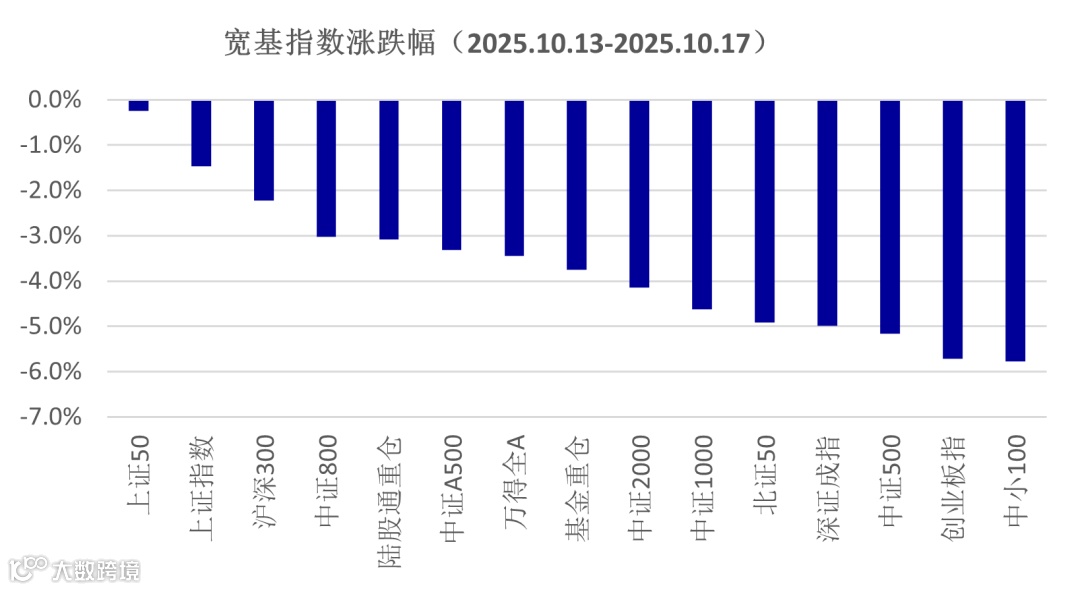 中美关税及相关问题的博弈升级,是影响上周市场的重要因素,A股整体呈现低开高走后,再度回落态势。周一大幅低开后持续回升,在经过四月份的关税冲击过后,市场已经可以很快消化中美关系的影响,投资者的担心情绪逐步下降,带动指数震荡回升;但中美高层的表态,导致部分投资者担心中美分歧太大,未来可能会出现更严重场景,在这种担忧之下,部分资金离场导致指数在周五大幅回落。上周万得全A指数下跌了3.4%,其中上证50指数跌幅最小,为0.2%,九月份表现强的创业板和中小100指数跌幅最大,分别下跌了5.7%、5.8%。市场成交额较前一周有所下降,万得全A日均成交为2.19万亿,仍在2万亿之上的历史高位。