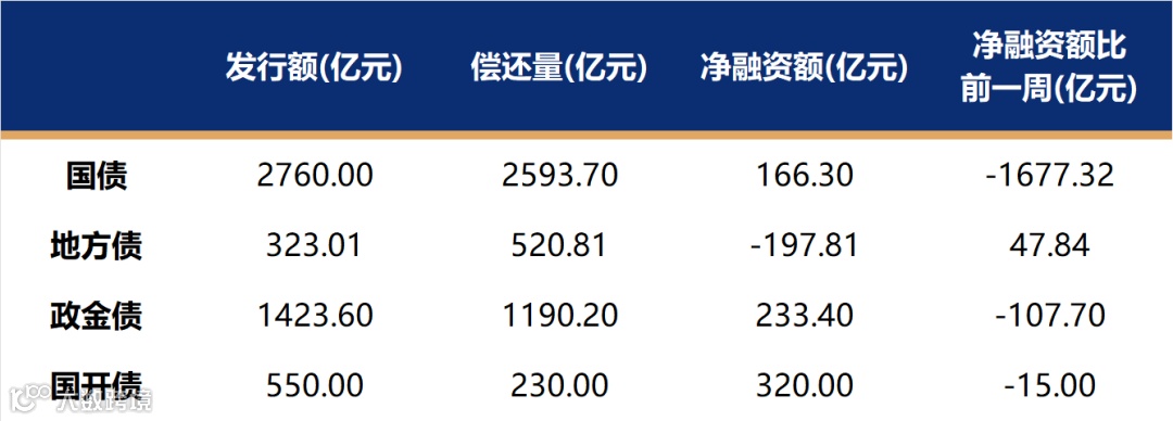 国债、国开、政金债、地方债发行量、偿还量、净融资额(与前一周比较)。