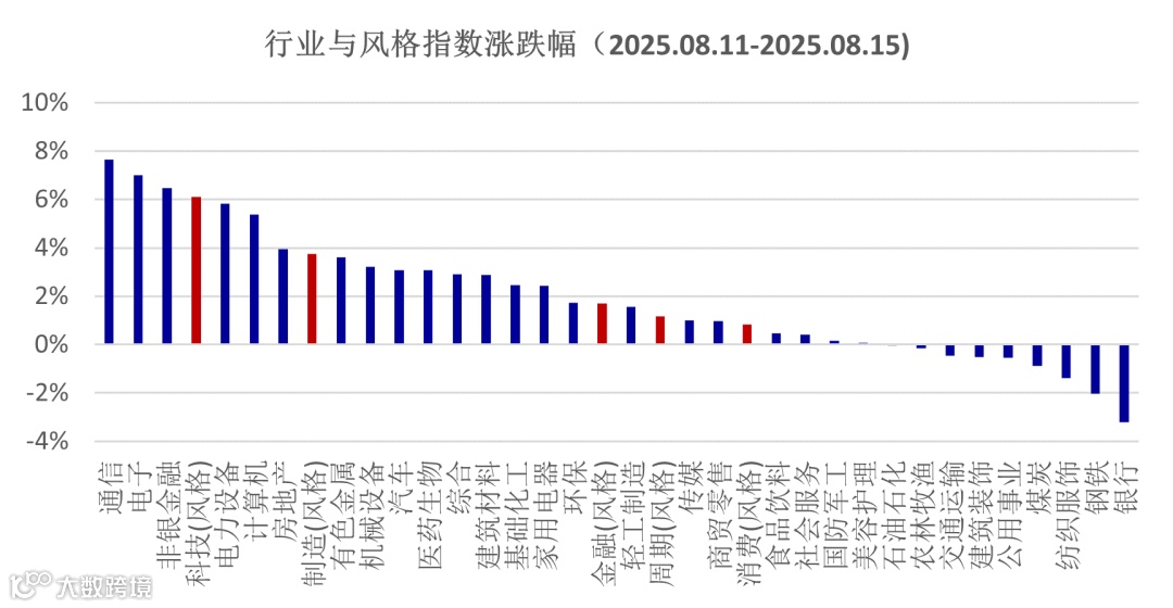 行业指数呈现出高弹性特征,科技成长板块和券商板块表现突出,通信、电子、非银金融板块分别上涨了7.7%、7.0%和6.5%。AI产业的逐步突破,带来相关板块的预期进一步提升,而通信和电子相关板块的业绩,也验证了产业逻辑。目前中美科技领域的竞争,主要体现在人工智能领域,未来也会加大该领域的投资,产业上行周期继续延续,产业链相关板块仍然是关注重点。上周银行板块表现较弱,风险偏好系统性提升的过程中资金流出红利板块的速度加快,这与目前市场上资金从固收市场转向权益市场类似。从中期维度看,保险仍是重要的机构配置力量,从资产负债平衡的角度看,其对红利资产的配置需求依然较强。