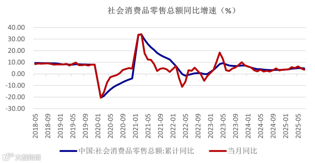 7月份的零售数据也出现边际转弱,当月同比增速由6月份的4.8%回落至3.7%,累计增速下滑至5%以下,为4.8%。从分项数据看,汽车、家电增速均环比回落,二者增速分别从6月的4.6%、32.4%回落至-1.5%、28.7%,这与财政发力节奏有较大相关性,也与季节性有关。