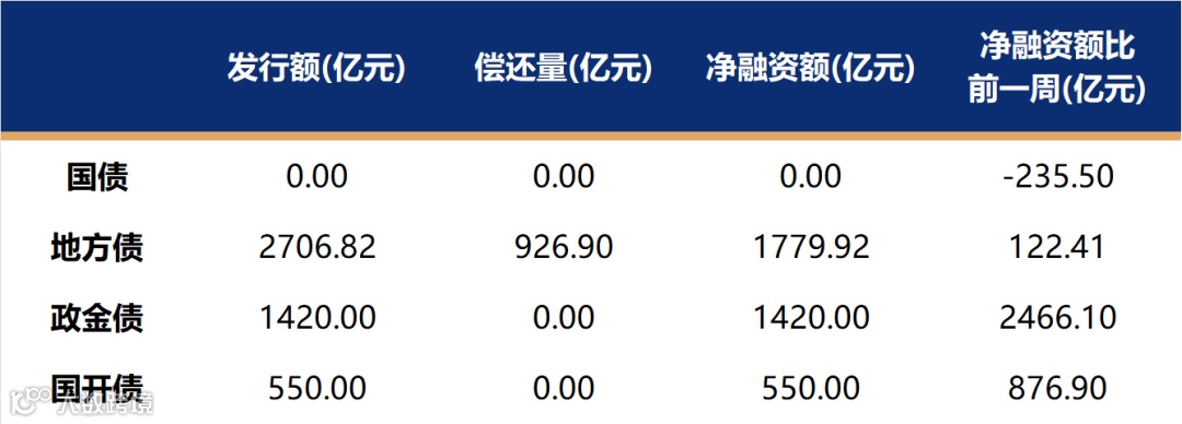 国债、国开、政金债、地方债发行量、偿还量、净融资额(与前一周比较)。