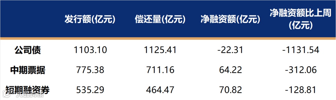 非金融企业短融、中票、企业债、公司债发行量、偿还量、净融资额(与前一周比较)。