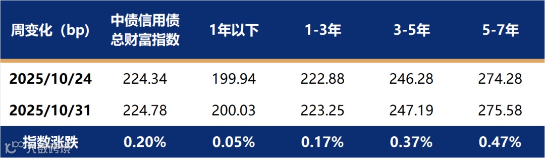 上周,信用债跟随利率债收益率下行,其中长久期信用债收益率下行幅度较大,中债信用债总财富指数大涨0.20%,其中5-7年指数涨幅相对较大。