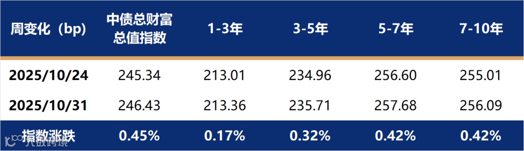 上周利率债收益率先小幅上行后大幅下行,整体表现偏强,国债收益率下行幅度大于国开债。影响上周债市走强的主要原因是央行于27日傍晚宣布恢复国债买卖,债市年末重磅利好落地,国债收益率大幅下行,但市场因前期债市持续的低迷情绪仍然偏弱,在上周二至周三有所反复。随着中美会谈结束、10月PMI数据偏弱等诸多消息落地,权益市场上涨乏力,债市情绪明显回暖,各期限收益率再度大幅下行。上周中债总财富指数大涨0.45%,其中5-7年、7-10年指数涨幅更大。
