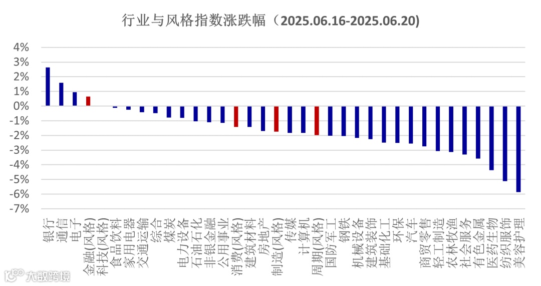 上周A股呈现出避险特征,金融风格表现较强,银行股领涨,稳定类的红利资产受到资金的追捧。红利属性强的运营商也有所上涨,海外算力带动的光模块板块回升,二者共同作用下,通信板块同样表现较强。上周消费和医药表现较弱,美容护肤和纺织服装领跌,跌幅分别达到5.9%和5.1%,医药生物板块也开始对利空敏感、对利空钝化,全周指数跌幅达4.4%。整体而言,轮动方向偏多、速度较快,部分场内投资者体感赚钱难度增加选择观望,导致市场成交量萎缩。