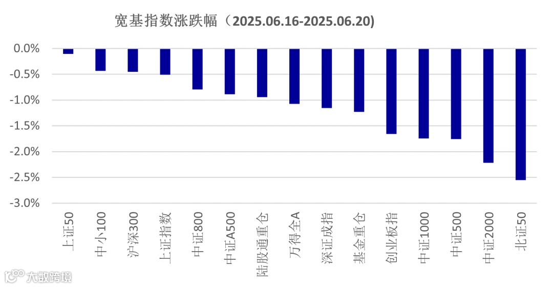 上周A股市场先扬后抑,地缘政治的影响加剧,以伊冲突的升级压制市场情绪,给市场带来了调整的压力。上周宽基指数全面回落,跌幅较小的是上证50,跌幅为0.1%,其次为中小100指数和沪深300指数,跌幅较大的是北证50指数和中证2000指数,跌幅分别达到2.6%和2.2%。市场整体表现出风险偏好的回落,高弹性板块的跌幅更大。