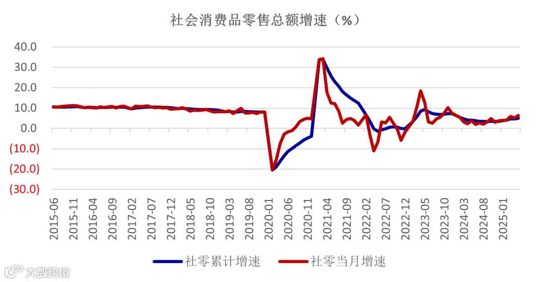 5月份社会消费品零售总额增速为6.4%,较5月份的5.1%上升幅度较大。从各分项数据看,家用电器和音响器材类单月增速为53.0%,较4月份的38.8%进一步回升,其对当月的消费品增速贡献为1.5%,通讯器材类单月增速为33.0%,较上月增速提升13.1%,对消费品增速贡献0.7%,这二者是最大的拉动因素。分析认为,这是受到家电、消费电子和电商企业促销影响,叠加以旧换新政策,带来了当月销售的快速增长。考虑到监管对以旧换新补贴额度的控制,预计未来两个月,家电和消费电子零售额增速会回归正常。基于此的推论,投资者并未对于单月的高增长定价行业指数,数据的持续性仍需要观察。