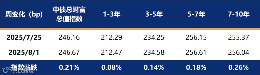 上周债市收益率先上后下,整体有所修复,各期限收益率均下行,国债中曲线中段下行幅度较大。影响全周债市修复的主要原因是一是中美贸易谈判未能有新的进展;二是政治局会议落地未明确提及“反内卷”;三是7月PMI数据明显低于预期,三方面因素叠加下,权益及商品市场交易情绪降温,债市缓步走强。上周中债总财富指数上涨0.21%,其中7-10年指数涨幅稍大。