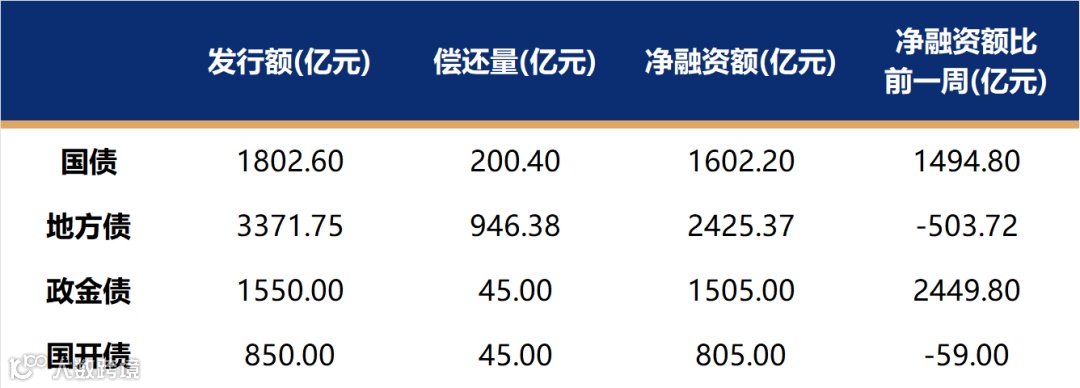 国债、国开、政金债、地方债发行量、偿还量、净融资额(与前一周比较)。