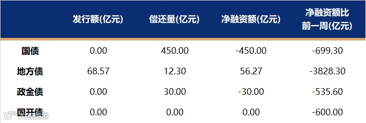 国债、国开、政金债、地方债发行量、偿还量、净融资额(与前一周比较)。