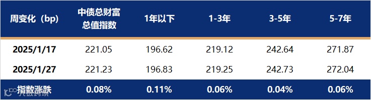 春节前最后一周(1月20日至27日)利率债整体表现较强,除1-3年期国债收益率小幅上行之外,其余期限收益率均下行,长端、超长端表现强于短端,曲线进一步平坦化。主要原因是债市配置力量仍然较强,但又受到资金利率持续偏高的制约,因此受到资金利率影响较大的中短端表现较弱,而长端表现坚挺。截至1月27日,1年期国债收益率报在1.3036%,较1月17日上行4.19bp;10年国债收益率报在1.6299%,较1月17日下行2.94bp。中债总财富指数微涨0.16%,其中7-10年涨幅相对较大。