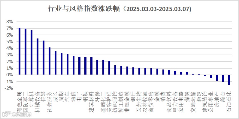 回顾前两周的市场表现,指数在3月初前后反应外部冲击出现回调,2月涨幅较高的主题板块调整幅度较大。但上周国内的政策推动以及科技领域的产品突破,再次推升市场的风险偏好,融资余额小幅下降后再次进入上行通道,反映投资者热情依然高涨。整体看,政策和产业趋势影响板块表现,宏观预期进一步恢复。