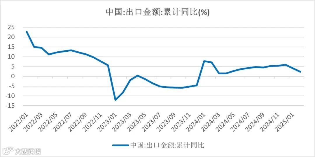 上周海关总署公布了我国进出口金额,数据显示1-2月出口金额的累计增速为2.3%,较2024年5.9%的增速有所下滑,但值得注意的是2024年1月、2月的累计增速为7.7%、7.1%,具有较高的基数,后续的出口是否继续承压需要观察。