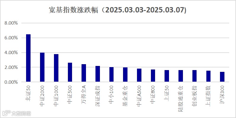 上周A股市场先抑后扬,伴随两会稳定投资者预期,指数也逐步企稳,全周主要宽基指数均上涨,其中北证50指数涨幅最大,上涨了6.5%,其次是中证2000和中证1000指数,沪深300指数涨幅最小为1.4%,市场表现小盘股风格特征。上周港股表现更强劲,恒生科技指数单周涨幅为8.4%,恒生指数涨幅为5.6%,科技股带动下香港市场重估行情继续演绎。A股市场成交量并未进一步放大,万得全A指数的日均成交额为1.70万亿,较前一周的1.99万亿小幅下降。