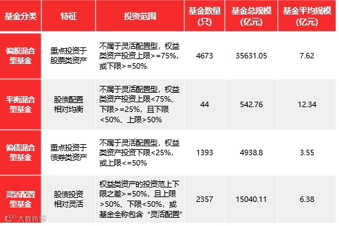 通过上面的表格,大家可以发现,偏股混合型基金的总规模遥遥领先,而平衡混合型基金的基金平均规模最大。平衡混合型基金在投资范围、投资比例上面与其他三类混合型基金有一些区别,在股债投资比例方面更为均衡。