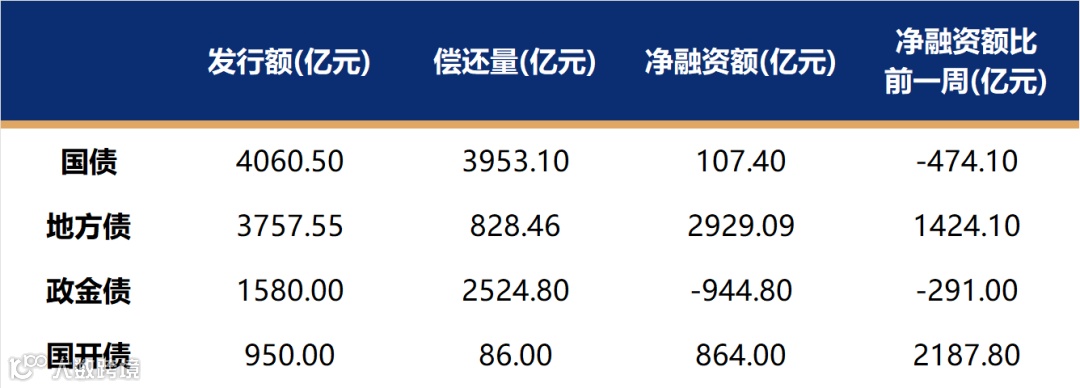国债、国开、政金债、地方债发行量、偿还量、净融资额(与前一周比较)。