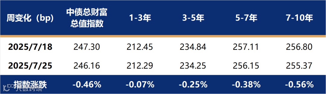 上周债市大幅调整,除一年期利率债之外,其余期限均上行约7-8bp,曲线平行上移。影响全周债市下跌的主要原因有二,一是“反内卷”政策持续推进,约束上游原材料供给,商品市场对于工业品价格反转预期大幅提升,上周大宗商品价格大幅上涨。二是上周央行连续4个交易日大规模净回笼,MLF净投放量较小,资金面承压,资金利率明显抬升。上周中债总财富指数大跌0.46%,其中7-10年指数跌幅较大。