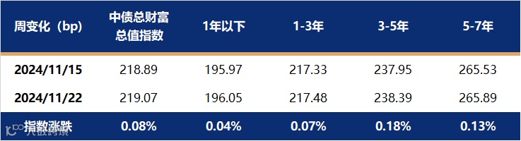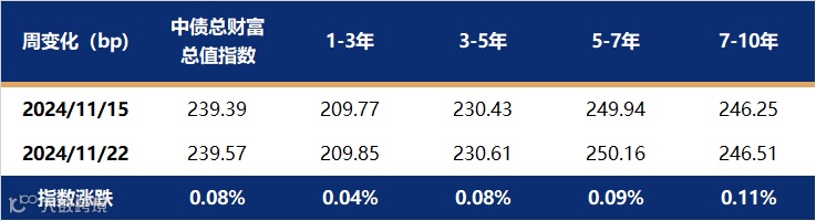 上周利率债收益率先上后下,国债各期限收益率均下行,短端下行幅度大于长端,曲线转陡峭,国债表现强于国开债。影响全周债市走势的主要原因是11月中旬多省市陆续出台再融资债发债计划,期限集中在10-30年,长期限、超长期限地方债供给比例超市场预期,债市长端出现调整。上周地方债发行结果好于预期,意味着市场承接能力较强,配置需求较大,且临近年末降准预期升温,利率债收益率转为下行。截至11月22日,1年期国债收益率报在1.3504%,较11月15日下行3.71bp;10年国债收益率报在2.0832%,较11月15日下行1.16bp。中债总财富指数微涨0.8%,其中7-10年指数涨幅稍大。