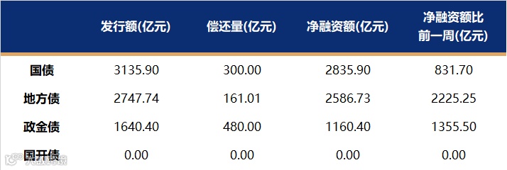 国债、国开、政金债、地方债发行量、偿还量、净融资额(与前一周比较)。