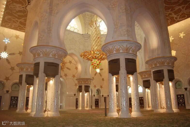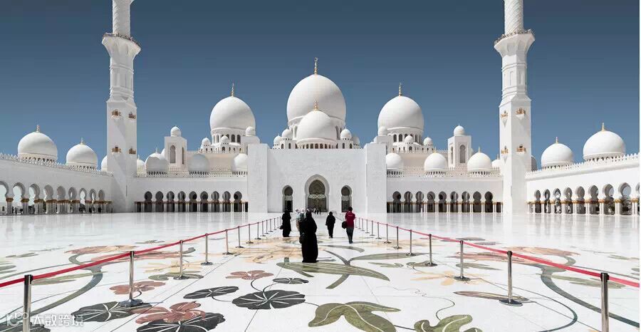 5、谢赫扎伊德阿联酋最大的清真寺,整个清真寺耗资五十五亿美元,建筑群都用来自希腊的汉白玉包裹着,白色典雅的外观,衬在蔚蓝的天空下,显得格外庄严肃穆。这里还是世上唯一一座允许女性从正门进入的清真寺。