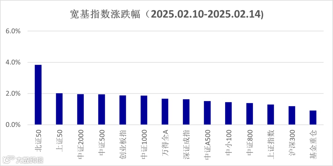上周A股市场延续了上行态势,结构开始出现变化,板块有扩散迹象。从指数表现看,涨幅最高的依然是北证50指数,显示出在风险偏好提升下板块的弹性。其次,上涨较多的是上证50指数,而非是小盘股,这反映市场行情出现扩散。从上证50的个股表现看,头部银行和运营商标的带动更强,这反映了红利属性和科技行情的扩散。再次,涨幅排序是中证2000、中证500、创业板,可以看出市场已经不仅是小盘股风格主导了。市场的成交量也继续放大,较前一周的日均1.62万亿上升至1.75万亿,活跃的市场成交量为行情打下了良好的基础。