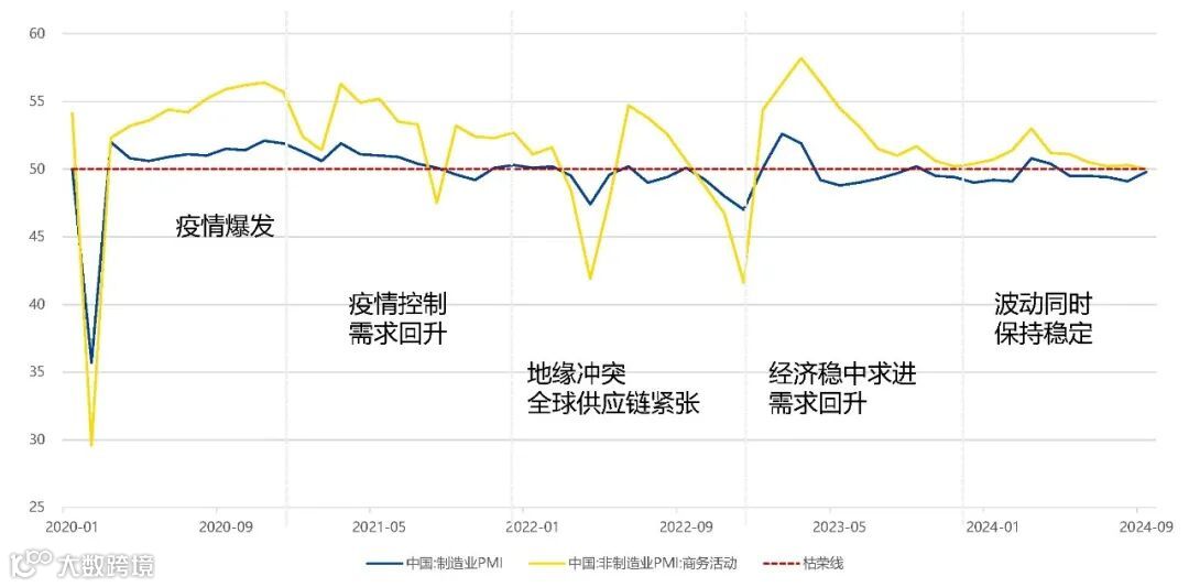 趋势:根据最新数据(截至2024/9/30),PMI指数在波动中保持相对稳定。虽然部分月份低于荣枯线,但整体趋势仍显示出经济的韧性。