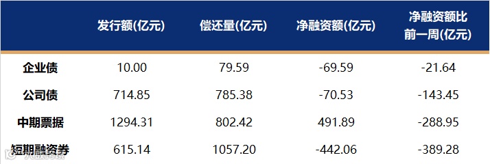 非金融企业短融、中票、企业债、公司债发行量、偿还量、净融资额(与前一周比较)