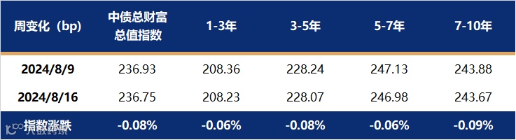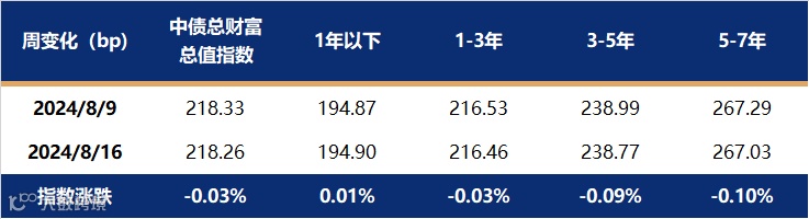 上周多数期限利率债收益率上行,短端上行幅度大于长端,曲线由陡转平。主要原因是前一周利率上行一度引发负反馈行为风险,因而中短端利率债抛压较重,且税期叠加政府债发行放量期间资金面边际收紧,中短端上行幅度较大。而利率长端、超长端收益率上行至降息前水平时获得以农商行、保险为主的买盘关注,情绪企稳。截止至8月16日,1年期国债收益率报在1.5341%,较8月9日上行7.79bp;10年国债收益率报在2.1978%,较8月9日下行0.08bp。中债总财富指数微跌0.08%,各期限跌幅均衡。