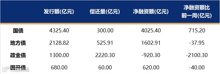 国债、国开、政金债、地方债发行量、偿还量、净融资额(与前一周比较)。