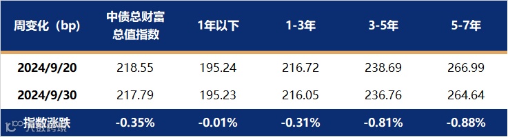 9月下旬(9月23日-9月30日)利率债出现一波调整,并于9月30日有所企稳,结构方面长债、超长债上行幅度较大,曲线由平转陡。导致债市调整的主要原因来自于政策重大转向超出市场预期,9月24日央行宣布降准降政策利率、降低存量房贷利率,并且创设新的货币政策工具,支持股票市场稳定发展;26日政治局会议再强调要加大财政货币政策逆周期调节力度,也提到了要努力提振资本市场,大力引导中长期资金入市。受此影响权益市场大涨,市场风险偏好明显提升,债市因前期已较为充分的反应了降准降息的预期,在股债跷跷板效应影响下本次跌幅较大。截止至9月30日,1年期国债收益率报在1.3679%,较9月20日下行2.31bp;10年国债收益率报在2.1518%,较9月20日上行10.87bp。中债总财富指数大跌0.86%,其中7-10年指数跌幅更大,1-3年指数跌幅相对较小。