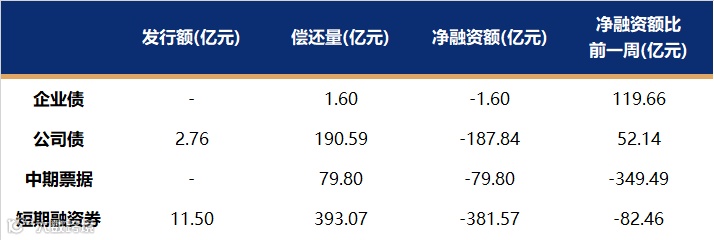 非金融企业短融、中票、企业债、公司债发行量、偿还量、净融资额(与前一周比较)