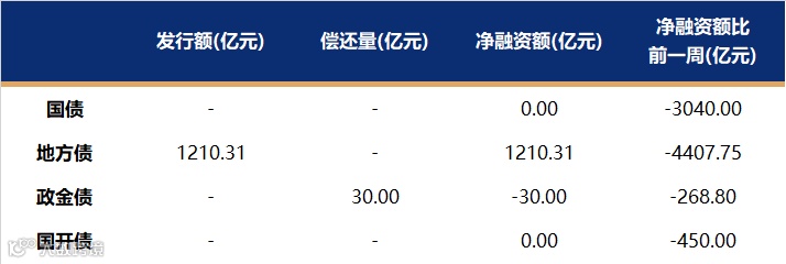 国债、国开、政金债、地方债发行量、偿还量、净融资额(与前一周比较)。