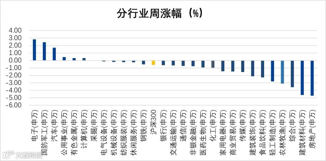进入5月第四个交易周,市场整体较前一周下跌。两市成交金额周均下跌至7,359.65亿元,北向资金周净流出56.61亿元,两融余额15,265.02亿元。截至上周五收盘,上证综指周跌0.07%,收于3,086.81点,深证成指周跌0.64%,收于9,364.38点,沪深300周跌0.60%,收于3,579.92点,创业板指周跌0.74%,收于1,805.11点。各行业(申万一级行业,下同)来看,电子、国防军工、汽车涨幅居前,分别为2.84%、2.43%、1.71%;房地产、建筑材料、综合跌幅居前,分别为-4.72%、-4.62%、-3.58%。