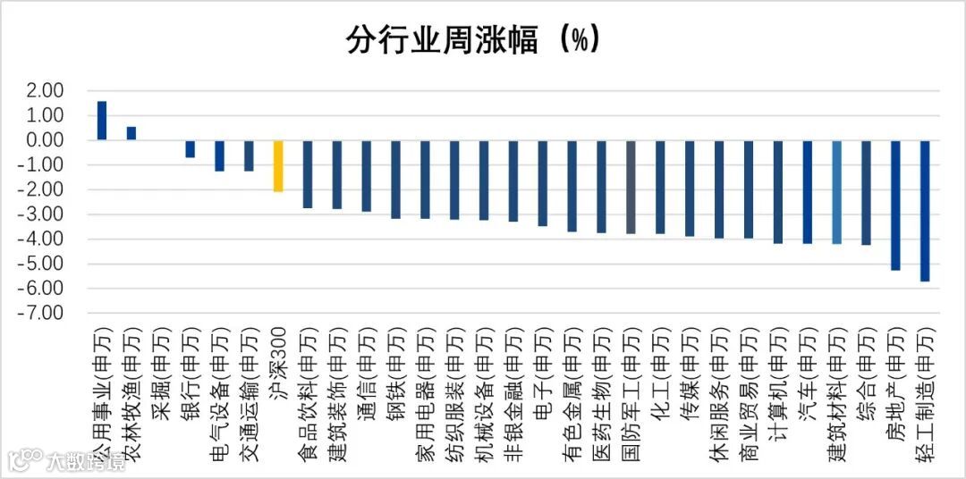 进入5月第三个交易周,市场整体较前一周下跌。两市成交金额周均上涨至8,517.30亿元,北向资金周净流入8.35亿元,两融余额15,302.61亿元。截至上周五收盘,上证综指周跌2.07%,收于3,088.87点,深证成指周跌2.93%,收于9,424.58点,沪深300周跌2.08%,收于3,601.48点,创业板指周跌2.49%,收于1,818.56点。各行业(申万一级行业,下同)来看,公用事业、农林牧渔涨幅居前,分别为1.59%、0.57%;轻工制造、房地产、综合跌幅居前,分别为-5.71%、-5.26%、-4.25%。