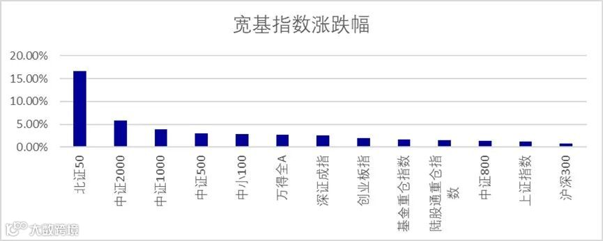 上周主要宽基指数震荡走高,市场成交量维持高位,万得全A指数成交额日均19097亿元。在充裕的流动性推动下,市场轮动加快,个股弹性得到明显释放,北证50受到的涨跌幅限制最小,弹性也最大。从宽基指数的走势看,规模指数呈现出市值越小、弹性越大的特征,中证2000、中证1000指数表现好于中证500指数,又均好于沪深300指数,也呈现出小市值个股的高弹性现象。
