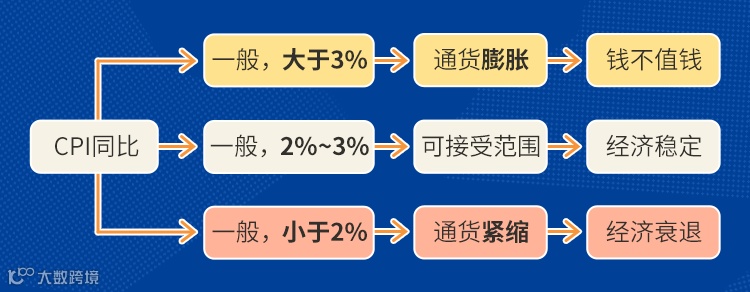 正常情况下:当CPI同比在2%到3%增幅内属于可接受范围,一旦同比涨幅连续数月大于3%,就是通货膨胀;如果连续数月同比涨幅超过5%,就是严重的通货膨胀。CPI过高,意味着通货膨胀,钱就不值钱了。但如果CPI过低,又代表通货紧缩,这是经济衰退的表现。