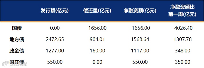 国债、国开、政金债、地方债发行量、偿还量、净融资额(与前一周比较)。