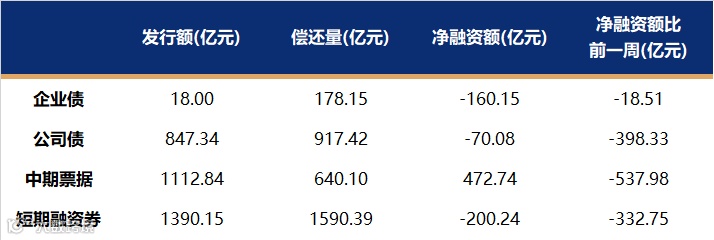 非金融企业短融、中票、企业债、公司债发行量、偿还量、净融资额(与前一周比较)