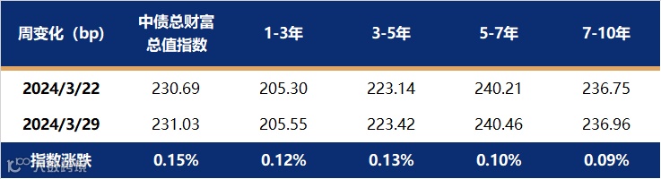 上周债市收益率先上后下,整体表现偏强,其中短端下行幅度大于长端,曲线由平转陡。一方面 “央行或参与国债购买”的消息一出激发债市做多情绪,且跨季资金面平稳偏松,对中短债利好。另一方面,二季度国债发行计划公布,其中“超长期国债发行安排另行公布”的表述引发市场对供给放量的担忧。截止至3月29日,1年期国债收益率报在1.7225%,较3月22日下行4.00bp;10年国债收益率报在2.2901%,较3月22日下行1.5bp。中债总财富指数微涨0.15%,各期限指数涨幅较为均衡。