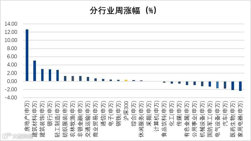 进入5月第二个交易周,市场整体较前一周持平。两市成交金额周均8,489.57亿元,北向资金周净流入87.62亿元,两融余额15,341.79亿元。截至上周五收盘,上证综指周跌0.02%,收于3,154.03点,深证成指周跌0.22%,收于9,709.42点,沪深300周涨0.32%,收于3,677.97点,创业板指周跌0.70%,收于1,864.94点。各行业来看,房地产、建筑材料、建筑装饰涨幅居前,分别为12.65%、5.03%、3.00%;家用电器、医药生物、汽车跌幅居前,分别为-2.36%、-2.12%、-1.76%。