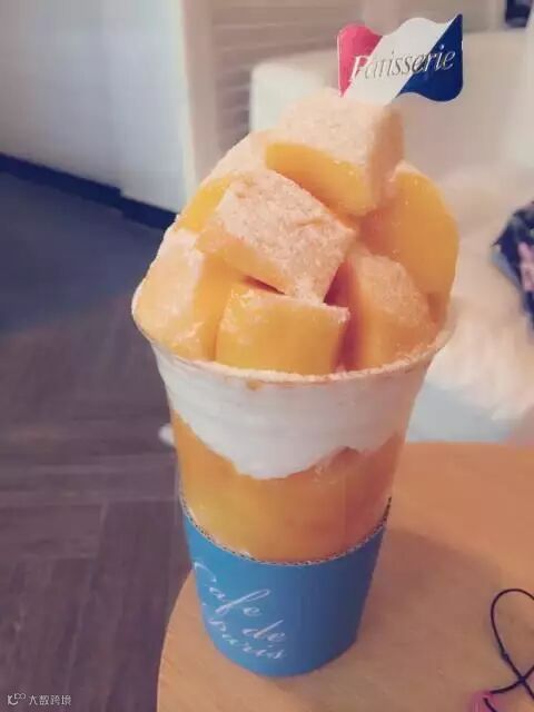 Cafe de paris是位于林荫路的一家咖啡厅。是用整整3个芒果现点现制而成,果肉大块而厚实,加上间隔的奶油和中心的芒果沙冰,酸甜清凉,一口塞进嘴里超幸福!除此之外还有草莓杯,树莓杯,以及短期内供应的樱桃杯哦!售价15000韩币(折合人民币84元,所以韩国留学生说的一点没错啊,在棒国吃水果会要吃出肉价啊)。