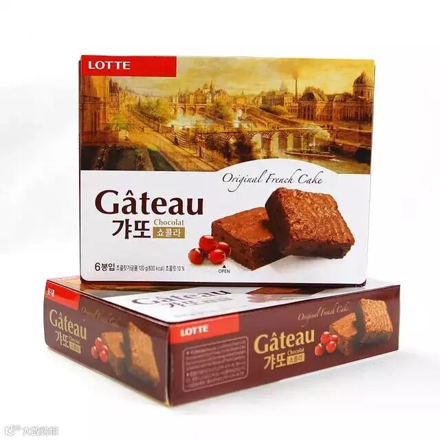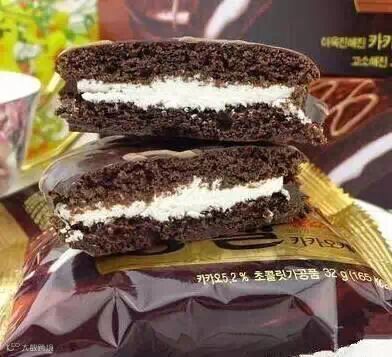 在两片柔软的蛋糕之间放入松软的含有果冻成分的果汁软糖,然后再以巧克力包裹而成。中间夹着甜而不腻的奶油,香软细滑,梦一般的感觉!难怪是韩国销量第一的巧克力派哦!