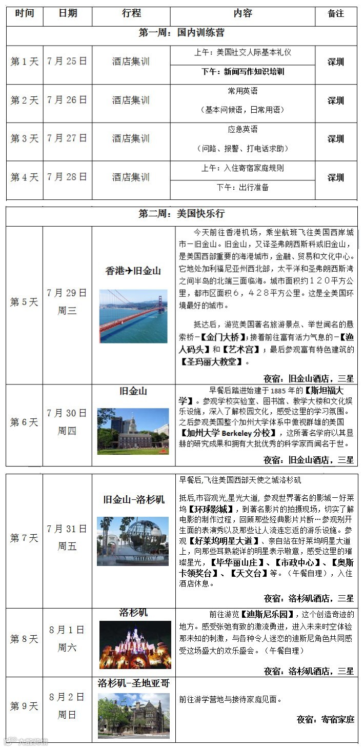 一切以“快乐学习”为主题,采用“封闭式英语训练+美国3地游”形式出行,历时18天,让孩子轻松玩转美国旧金山、洛杉矶、圣地亚哥、三座城市;