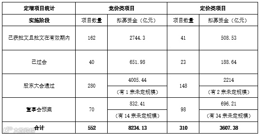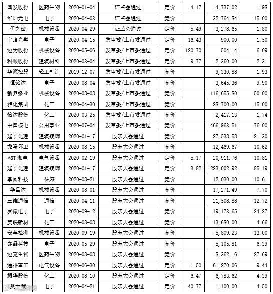 截至2020年10月23日,实施状态处于不同阶段的竞价类和定价类定增项目汇总如下: