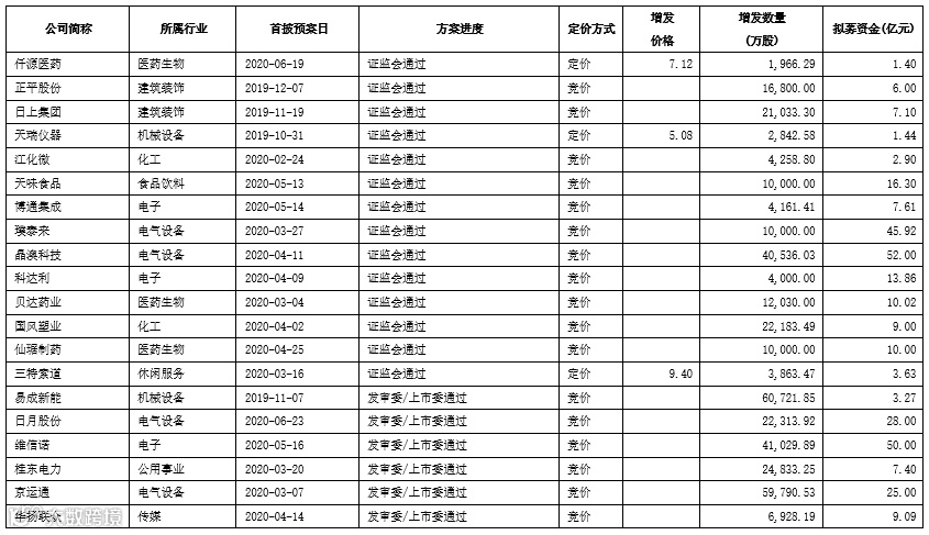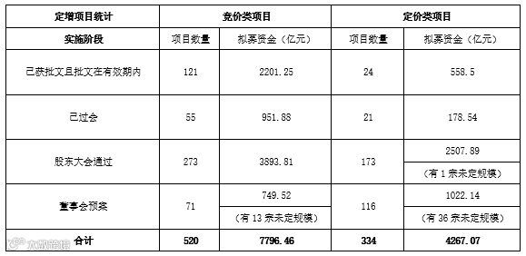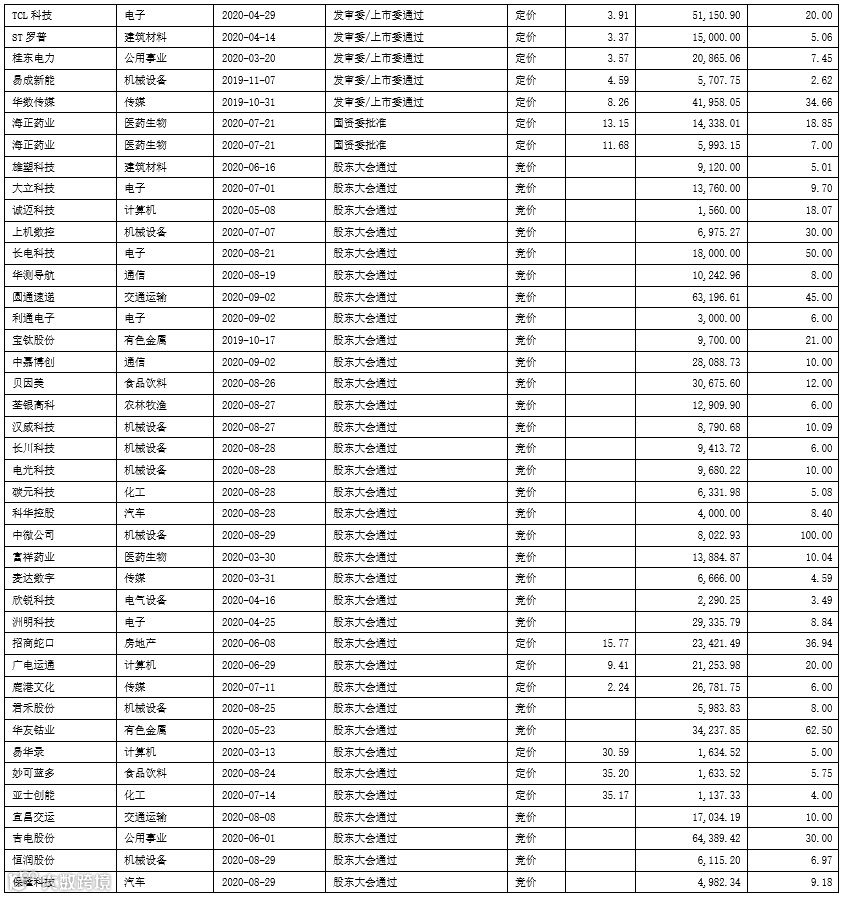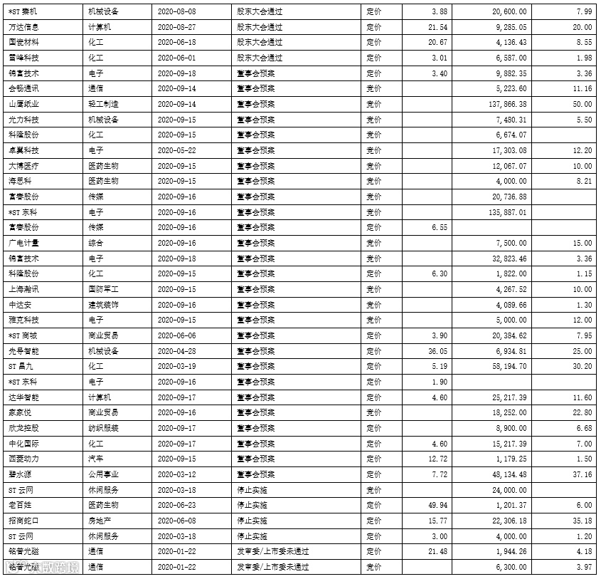 截至2020年9月18日,实施状态处于不同阶段的竞价类和定价类定增项目汇总如下: