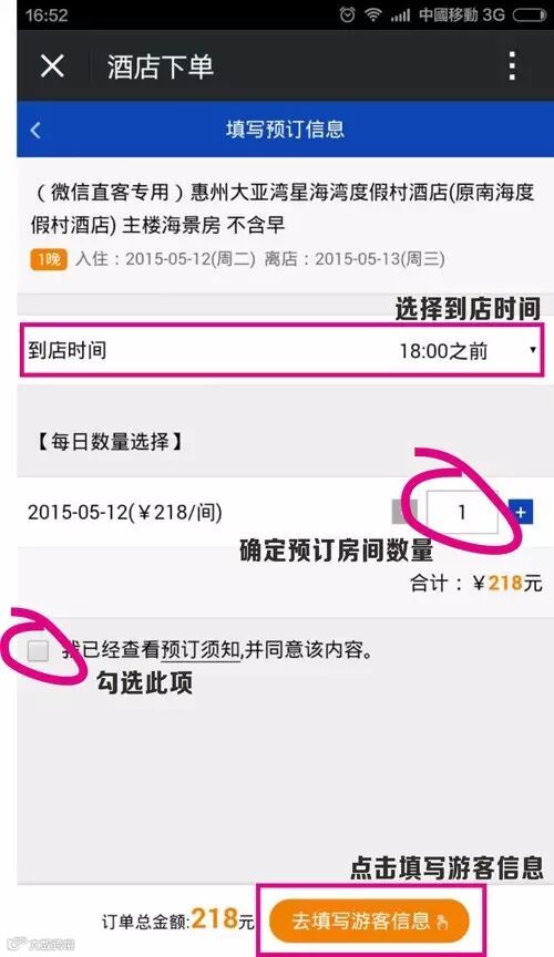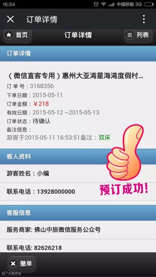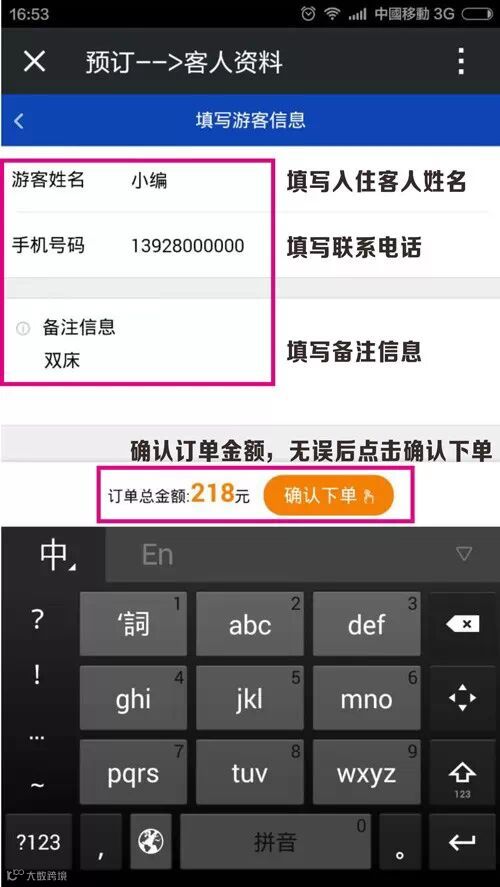 第四步:填写游客资料,点击“确认下单”完成预定: