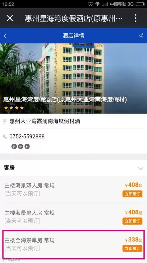 第二步:进入自由行展示页面,选择合适自己要求的酒店预订: