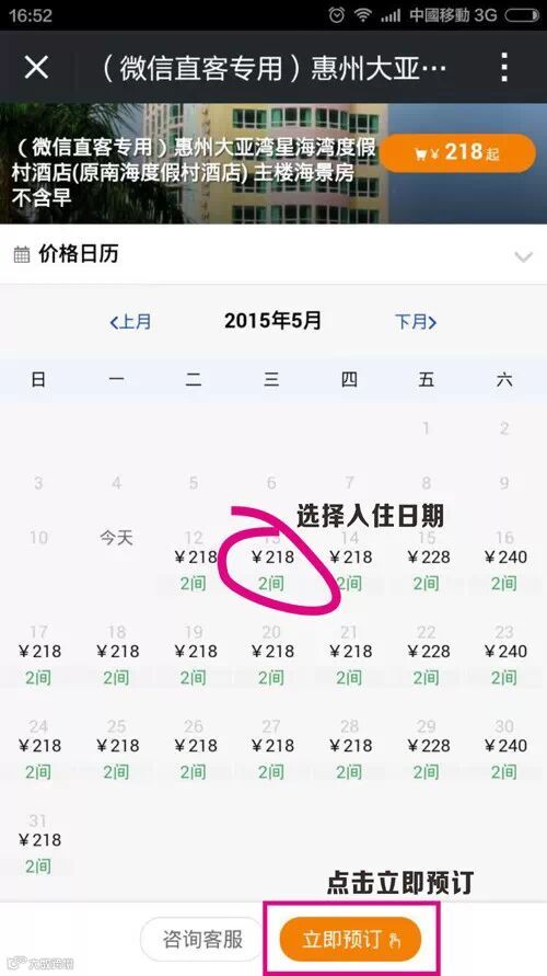 第三步:进入具体行程界面,直接选择日期进行预订。需注意每个房型及房费所包含的人数及该房型是否可以实时确认。