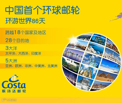 2015年歌诗达邮轮环游世界86天,跨越18个国家及地区,28个目的地,3大洋,5大洲,实现真正的环游世界,实现环球梦想。